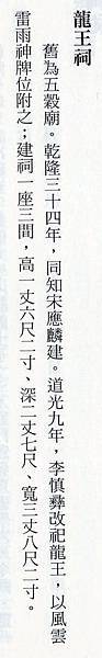 之後龍王廟的規模應該有擴大,根據總督府檔案記載,該廟有前後兩堂,可能是擴充為兩進的意思。