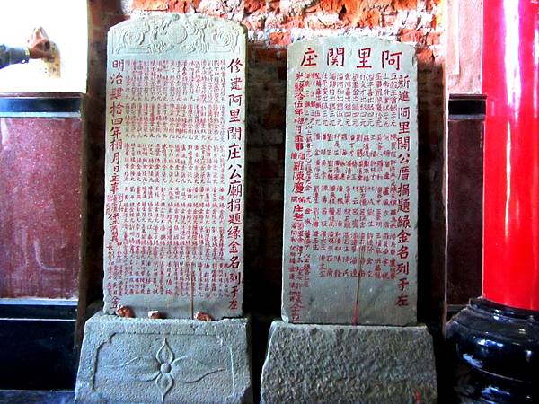 碑文中,出現了「五穀王會」與「上帝令會」兩個捐款單位,各自捐款最大筆的銀二十元(照片1之4)。五穀王會裡的「五穀王」,即神農大帝;上帝令會裡的「上帝」,即玄天上帝──兩尊神尊,乃是公厝主神。碑文裡,還出現捐款人「吳客人」(照片1之5)──這位吳客人,在明治四十四年的〈修建阿里關公廟捐題緣金碑記〉裡是以甲長身份出現,且捐了款(照片1之2與6)。