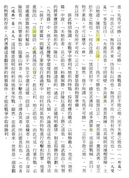 兵法曰:「凡處軍相敵,絕山依谷(近水草,便利也。絕,過也。依,近也。言若行軍經過山險,須近谷而處,有水草之利也),視生處高(生者,陽也,處高而面南向也),戰隆無登(隆,高也。言敵人在高,我不可自下往高,仰敵人而接戰,敗。處高勿攻是也),此處山之軍也,教山戰(凡寇敵保據山谷,攻擊進戰與平陸不同,或登峰陟嶺,或援樹引藤,或透險緣崖,理須素教又令便習也)。絕水必遠水(寬敵令渡也),客絕水而來,勿迎之於水內,令半渡而擊之(半渡,勢不並,易擊而敗也)。欲戰,無附於水而迎客(附,近也。近水迎之,敵軍不肯渡),視生處高(視生,向陽遠視也。軍處高,遠見敵勢,則敵不得潛來,出我不意者也),無迎水流(水流之地,可以既吾軍,可以流毒藥。一雲逆流而營軍,兵家之忌也),此處水上之軍也。平陸之軍處易(平陸必擇其坦易平移之處,我軍騎得以馳逐之也),而右背高,前死後生(戰便也。太公曰:軍必左川澤而右丘陵。死者,下也;生者,高也。下不可以御高,戰不便於軍馬也),此處平陸之軍。地絕斥澤,雖急去無留。如交軍於斥澤之中,依水草而倍眾樹(不得已與敵會於斥澤之中,即須有水章林木處軍也),此處斥澤之軍也。凡四軍之制,黃帝所以勝四帝者也。吳子問孫武曰:「敵人保據山險,擇利而處之,糧食又足,挑之則不出,乘間則侵掠,為之奈何?」曰:「分兵守要,謹備勿懈,潛探其情,密候其刃,以利誘之,禁其牧采。久無所得,自然變改。待離其固,則奪其所愛也。」又魏武侯問於吳起曰:「凡左右高山,地甚狹迫,卒遇敵人,擊之不敢,去之不得者,奈何?」曰:「此谷戰也,雖眾不用。當募吾材士,與敵相當,陽為不驚,輕足利意,以排前行。分車列騎,隱於四旁,相去數里,無令見兵。敵必堅陣,進退不敢。於是出旌列旗,行出外山,營之,敵人必懼。以騎挑之,勿令休息。敵若堅守,急行間諜,以觀其變亂,則擊之,縮則復之。此可勝也。」凡谷戰之兵,巧於設伏,選精銳,當前列以強弩。次以短兵,勇斗而速戰。又選輕足之卒,擇徑升高下瞰,敵兵而戰,或多建旗鼓,自高以震之。凡於山峽,卒遇敵,即急鼓譟,先使其驚亂,然後合變以擊之。凡發兵深入,遇大林木,與敵分林相拒,謂之林戰。以我軍分為沖陣,便兵所處,矛弩為表,戰盾為里。斬除草木,極吾廣道,以便戟所。高置旌旗,謹飭軍眾,無使敵人知吾情實。然後卒吾矛弩,相與為伍。若遇林樹少,則以騎為輔,見利則戰,未利則止。若遇林木多,又有險隘阻,以沖陣謹備前後,更息更戰,敵人必走。又林戰之道,晝廣旌旗,夜多火鼓,利用短兵,巧在奇伏,或發於前,或起於後,左之右之,中以強弩。利且守險而止。擊冒頓,冒頓匿其精兵,見其羸弱。漢悉兵北逐之,高帝先至平城,步兵未盡到。冒頓縱精兵三十萬,圍之白登七日。此已然之驗也。近世賊兵奇策,亦不過是,此名將之所察,而愚將之所陷也。然其技藝與中國異,上下山阪,出入溪澗,而中國之馬弗與也(與猶如也);險道傾反,且馳且射,中國之騎弗與也;風雨罷勞,饑渴不困,中國之人弗與也。此賊寇之長技也。若夫平原易地,輕車突騎,則匈賊之眾易撓亂也;勁弩長戟,射疏及遠,則賊寇之弓弗能格也;堅甲利刃,長短相雜,游弩往來,什伍俱前,則匈賊之兵弗能當也;材官騶發(騶,矢之善者),矢道同的,則賊寇之革笥木薦(革笥以皮作,如鎧皮之。木薦以木薦作,如孽扌餚也)弗能及也;下馬地斗,劍戰相接,去就相簿,則寇賊之足弗能給也。此中國之長技也。以此觀之,寇賊之長技三,中國之長技五。前史稱胡兵五,而當漢兵一;今雖頗得漢巧,猶三而當一。是中國之利器居多。且其人善騎而不善步,中國步兵有強弩利刃之銳,足以抗之。然中國之不敵者,人性習安,不若其耐勞苦於霜雪、沙磧、不毛之地;又其性不善攻,攻亦不久,惟利衝擊,故前世名將必以奇制之,而不與爭馳逐也。南之夷蠻,其性剽悍狠怒,樂為盜賊,而勢不能堅;惟用標槍、旁牌、飛刀、環刀、木弩以為兵械;善為藥箭,中者大叫,信宿輒死;依山阻水,怙恃其險,急則竄伏,緩則鈔掠;浮舡則水道多絕,陸行則險阻不進,非中國之所能。擊此之法,利於平地,以奇略誘其人,隱伏精兵,竊發而禽之。誘之術,多縱反間,出甘言重幣,招使致來,則入吾計中。大凡中國之民,屋宿火食,衣被繒纊,北方殺氣早降,手足皸瘃,不能渡漢;南方暑濕,溪谷毒癘,不能逾嶺。以中國之人戍守,則十不當一,故古者以蠻夷攻蠻夷,則強弱相當。是以濱塞之民召募為用,斗曠土以食之,厚賞格以激之,馳射格鬥是其素所畜積,省縣官之費,減轉餉之勞,多縱間諜,以重賂誘其酋豪大姓,使之攻擊,比用華人其利十倍。故吳起,古之善將也,亦常論六國之俗不同:曰:「夫齊陣重而不堅,秦陣散而自斗,楚陣整而不久,燕陣守而當走,三晉陣理而不用(三晉,韓趙魏也)。夫齊性剛,其國富,君臣驕奢而簡於細人,其政寬,祿不均(齊成王新立,不理國政,委於卿大夫,故言驕奢而祿不均。簡者輕易細人,皂隸牧關之人也),一陣兩心,前重後輕(上驕下怨,故曰二心)。擊之之道,必三分之,獵其左右,脅而從之,其陣可壞(卒不敢倫偷生,故其陣自壞也)。秦性強,其地險(秦左崤函,右隴,終南、太白在前,朔方郡固其後),其政嚴,賞罰明。其人不讓,皆有斗心,故散自斗也(秦孝公用商鞅強國之術,人皆勇於公戰,依於私鬥也)。擊此之道,必先示之以利,引而去之。士貪於得而離於將,乘乖設伏,其將可取。楚性弱(江淮之間,地薄水淺,人性怯懦),其地廣,其政躁,其人疲,故整而不久(楚悼王急於政令