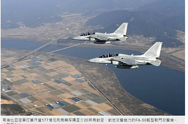 〔即時新聞/綜合報導〕近日有消息指出,哥倫比亞空軍選擇了FA-50作為下一代噴氣式教練機,並打算斥資6億美元(約新台幣177億元)向南韓採購至少20架有對空、對地攻擊能力的FA-50輕型戰鬥攻擊機。