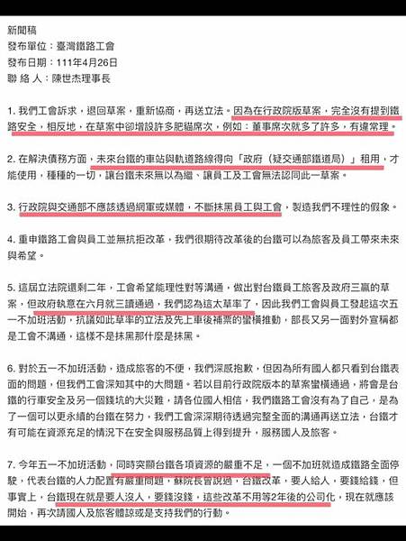 六、對於五一不加班活動,造成旅客的不便,我們深感抱歉,但因為所有國人都只看到台鐵表面的問題,但我們工會深知其中的大問題。若以目前行政院版本的草案蠻橫通過,將會是台鐵的行車安全及另一個錢坑的大災難,請各位國人相信,我們鐵路工會沒有為了自己,是為了一個可以更永續的台鐵在努力,我們工會深深期待透過完整全面的溝通再送立法,台鐵才有可能在資源充足的情況下在安全與服務品質上得到提升,服務國人及旅客。
