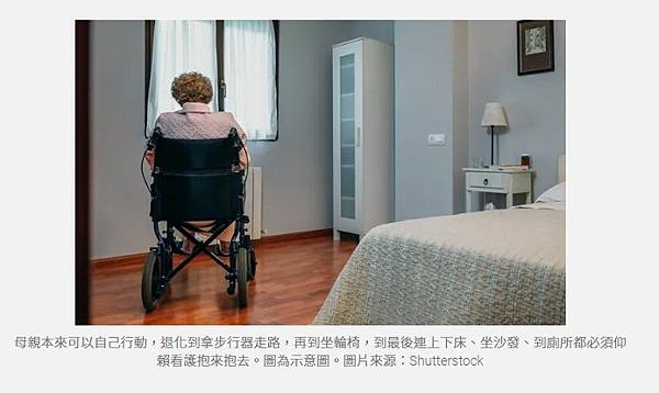 母親本來可以自己行動,退化到拿步行器走路,再到坐輪椅,到最後連上下床、坐沙發、到廁所都必須仰賴看護抱來抱去。圖為示意圖。圖片來源: