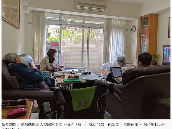 斷食期間,畢媽媽的家人都回家陪她。孫子(右一)採訪阿嬤,紀錄她一生的故事。 圖/取自50+(Fifty Plus)
