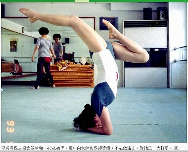 畢媽媽過去很會做瑜珈,48歲初學,幾年內就練到教師等級。不能做瑜珈,對她是一大打...