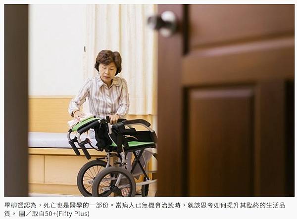 畢柳鶯認為,死亡也是醫學的一部份。當病人已無機會治癒時,就該思考如何提升其臨終的生活品質。 圖/取自50+(Fifty Plus)