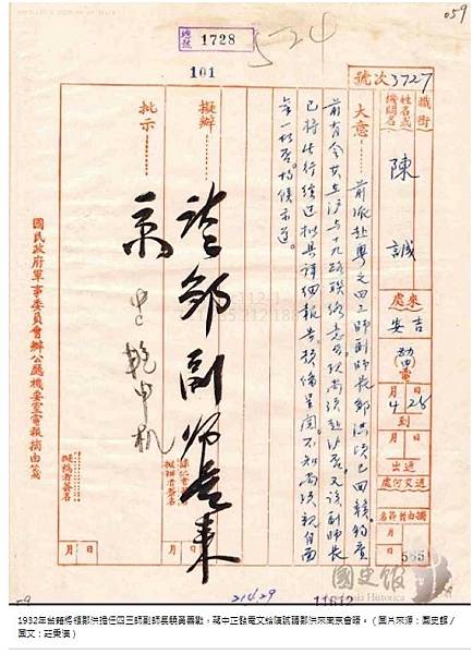 1932年台籍將領鄒洪擔任四三師副師長驍勇善戰,蔣中正發電文給陳誠請鄒洪來南京會晤。(圖片來源:國史館/圖文:莊秉漢)
