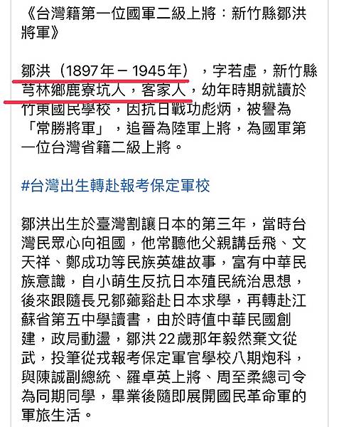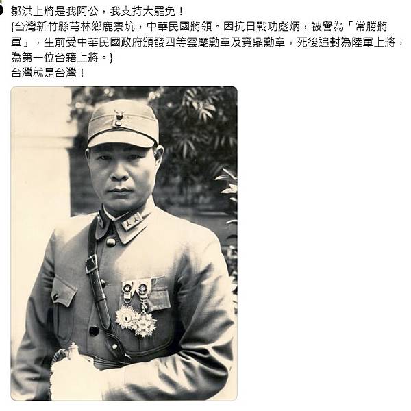 不過,鄒洪將軍確實是台灣人投身國軍對日抗戰的表率,帶兵打戰絲毫不遜於黃埔將領,歷史應該要記住鄒洪將軍,因為二戰時期,台灣人除了被大日本帝國招募、徵召充任日籍台灣軍伕外,還有像鄒洪這等台灣青年人,反其道而行,選擇越過黑水溝,奔赴大陸唐山,為自己的故國、為了自己的信仰不惜捨命奮戰。史話》被課綱遺忘的第一位台籍國軍上將(莊秉漢) - 兩岸史話 - 言論 https://bit.ly/3ldUyK6