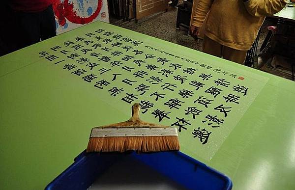 將刷過的作蓋上棉紙,同樣再用漿糊刷過