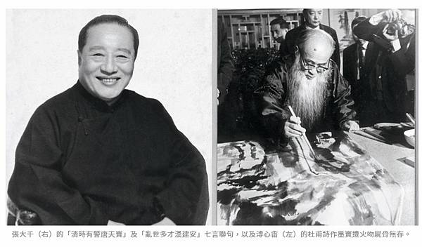 張大千(右)的「清時有警唐天寶」及「亂世多才漢建安」七言聯句,以及溥心畬(左)的杜甫詩作墨寶遭火吻屍骨無存。