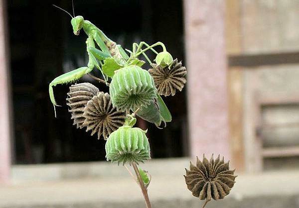 有同學問老師,如果在野外看到「螳螂」站在「磨盤草」上,客家話要怎樣講?是不