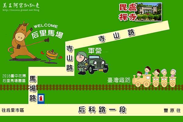 走到后里馬場正門,右轉到底會遇見營區再左轉。