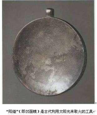 古代的取火方法是逐步發展的.最初是利用自然火種,繼之是摩擦取火和燧石取火,再進一步,則是利用太陽能取火.周代,我國人民發明並使用了「陽燧」(即凹面鏡).陽燧也稱「夫燧」.我國古代稱取火的工具為燧,所以「陽燧」的意思就是利用太陽光來取火的工具.《周禮·秋官司寇》說:「司烜氏掌以夫燧取明火於日.」《淮南子·天文訓》說:「故陽燧見日,則燃而為火.」