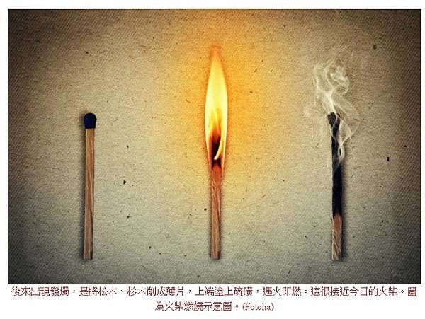 後來出現發燭,是將松木、杉木削成薄片,上端塗上硫磺,遇火即燃。這很接近今日的火柴。圖為火柴燃燒示意圖。(Fotolia)