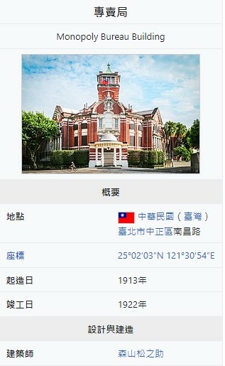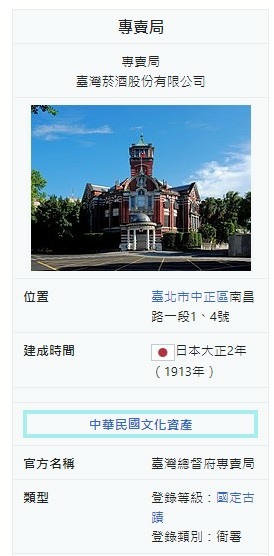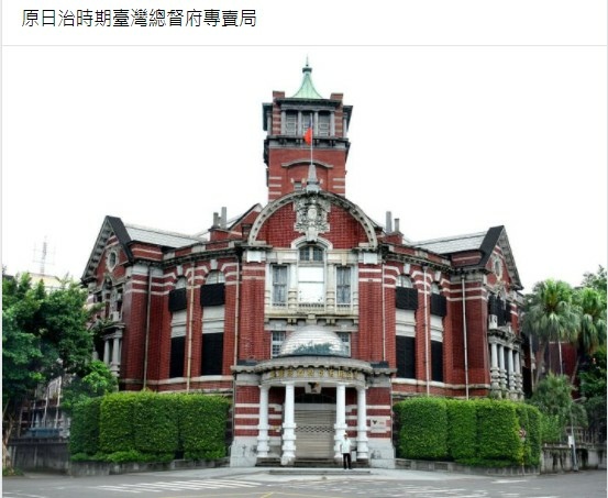 專賣局(今改制為臺灣菸酒股份有限公司),由日治時期臺灣總督府於1901年成立,今日專賣局之廳舍於1912年7月15日始建,1913年4月28日舉行上棟式,1915年完工,至1922年延伸專賣局廳舍之東翼興建新廳舍,作為專賣局酒課辦公室之用,於1923年竣工,成為當時臺北市的重要地標。
