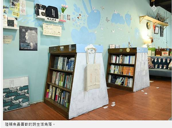 赤峰街的詩生活走入五週年,距離十年限定的承諾已達一半。年初換上新貌,水藍牆面多了塗鴉,書櫃靜靜靠牆,這是詩人店長陸穎魚最喜愛的角落。其實圖畫是規畫之外的,因為資金僅容處理一面壁癌,於是這樣掩飾另一面瑕疵;此次改裝也換下許多舊書櫃,但保留了很重、很舊、卻形狀特殊的兩座,「以前很多讀者會直接坐在地上,抽書看。」那是不捨得丟掉的記憶。