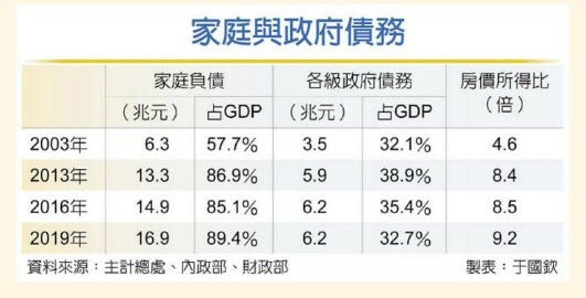 根據統計,家庭部門的負債於2003年底只有6.3兆元,占GDP不及六成,2020年底升至18.2兆,占GDP已逾九成,若非十七年來家庭負債成長速度超過GDP成長速度,這個比值不會由六成升逾九成,這說明我國家庭部門的債務成長太快了。