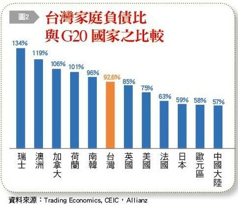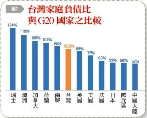由此可知,十七年來家庭部門的債務成長速度遠遠在政府債務之上,若說政府債務值得憂心,那麼家庭部門債務豈不更危險?若說政府債務有債留子孫之憂,家庭債務不用等到子孫就已危機四伏了。再者,政府在償債這件事上還是有優勢地位的,當國庫空虛,預算吃緊,政府可以發行公債、擴大稅基、調升稅率來融通,但是家庭部門就沒有這麼幸運了,一旦負荷不了,還不了債息,非僅日子難過,個人信用也將為之破產,若轉而向地下錢莊借錢,那麼未來的人生將更加悲慘,又如果家庭負債升高不是少數人的特例,而是中產家庭普遍的處境,那麼終將要影響金融體系的穩定,以及社會的安全了。