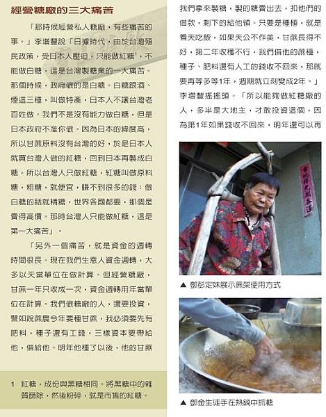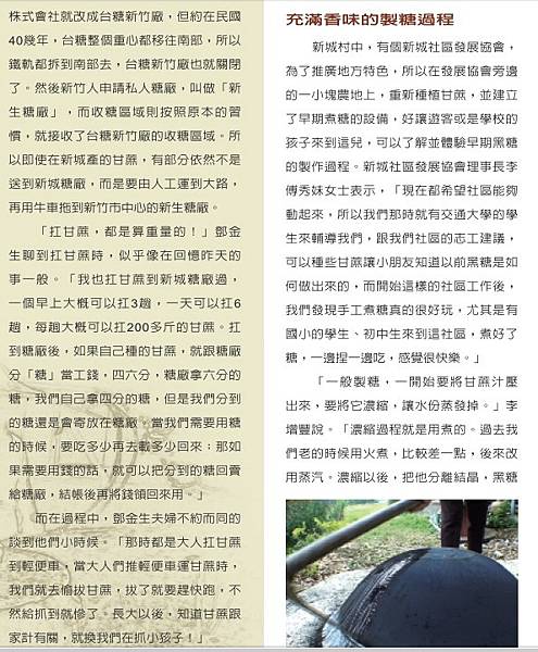 ,把這些甘蔗汁熬煮濃縮,就成可製糖。新城糖廠在全盛時期,從採收甘蔗工、載運工、榨汁工、裝卸工、包裝員到司機、守衛,大大小小有二百多人,每天分三班,機器二十四小時運轉。