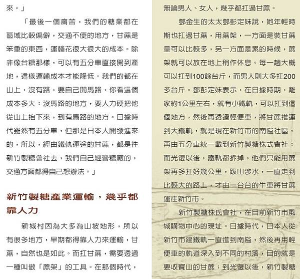 以新城糖廠為中心,小火車、臺車軌道遍布全鄉‧牛車、人力挑運也成為運送甘蔗的方式,甚至遠至頭份、苗栗收購甘蔗,本鄉「紅糖王國」之名,不脛而走。
