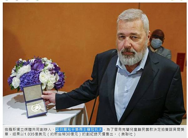 〔即時新聞/綜合報導〕俄羅斯獨立媒體《新報》(Novaya Gazeta)總編輯、諾貝爾和平獎得主穆拉托夫(Dmitry Muratov),為了替烏克蘭兒童難民籌款決定在美國紐約拍賣諾貝爾獎章,最終以1.035億美元(約新台幣30億元)的創紀錄天價售出。
