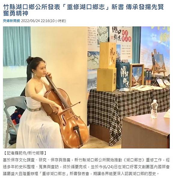 新竹縣湖口鄉公所今日這場「重修湖口鄉志」新書發表會,邀請竹縣府民政處長賴江海及湖口鄉民代等多位貴賓共襄盛舉,活動首先開場是主辦單位精心安排的特色表演,邀請「竹塹公主」才藝網紅賴立文表演大提琴,在悠揚的古典琴音中,現場與會貴賓們沉浸在史書和樂聲的文化激盪共融中,透過大提琴音樂聲傳遞「重修湖口鄉志」新書編纂過程之刻骨銘心的文化傳承;表演過後,現場抱以熱烈掌聲稱許,讓人感動之餘,並讚佩主辦單位將一場文化活動成功挹注美妙琴音樂章,突顯這本鄉志新書在湖口鄉發展過程中扮演重要文獻之歷史地位。