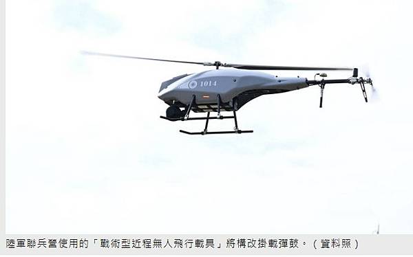 國家中山科學研究院今天邀請媒體參訪軍用無人機發展狀況。中科院簡報指出,旋翼機型無人機載重能力高、懸停時間長、可定點長時間監控,抗天候能力佳,可耐6級強風,且具備自主起降、雙機導控與即時影像傳輸等功能,將肩負近海與岸陸地區戰術偵察與監視,並可介接、國軍情傳系統。
