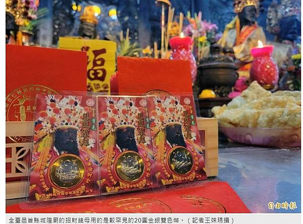 全臺邑首縣城隍廟的招財錢母用的是較罕見的20圓金銀雙色幣。(記者王姝琇攝)