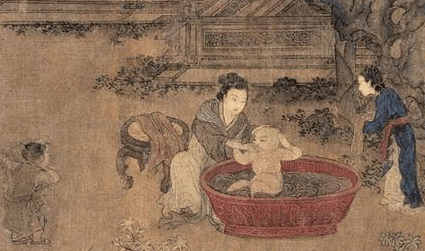 誕生禮儀中沐浴亦很重要,《禮記·內則》載:“世子生,則君沐浴,朝服,夫人亦如之。”又載:“公庶子生,就側室,三月之末,其母沐浴,朝服見於君。”太子出生,國君和夫人要沐浴穿朝服去朝見國君。