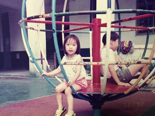 1992年,高雄市信義國小,Ria 和哥哥坐在遊樂設施「地球號」裡。(謝謝網友 Ria Yang 分享童年照片)