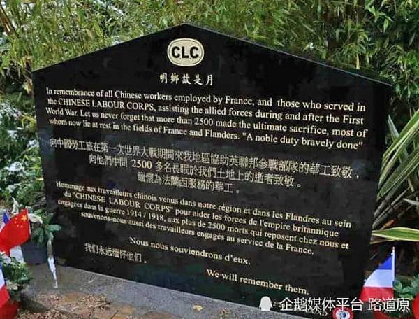 1998年11月,法國政府為一戰中在法國戰場上犧牲的華工樹立了墓地和紀念碑,紀念在第一次世界大戰中為法國捐軀的中國勞工。 所有的墓碑都朝向東方,讓這些東方赤子們,能够在異國他鄉,遙遙地望向自己的祖國
