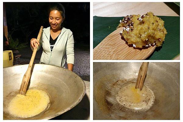 更令人感動是晚餐時間,大家圍在大灶圓鍋旁,聽農場女主人Ngavan(全曉玉)邊動手邊講故事,說了一則有關油芒和老人家的故事。她說曾經有部落老人家對她說,非常想念dil的味道,當時曉玉根本不知道dil是什麼?直到她遇見了油芒,才恍然大悟老人家日夜思念的味道就是油芒。遺憾的是,老人家在離開之前,都沒有機會再嘗到油芒的滋味。曉玉將此道油芒和小米一起慢慢搖煮的食物取名為「記憶的味道」。菜名取的很貼切,很有情感,這是原住民老人家畢生思思念念、難以忘懷的味道啊!