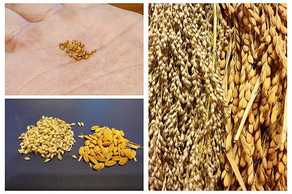 油芒和稻穀的比較,油芒穀粒小,口感較米粒韌硬。