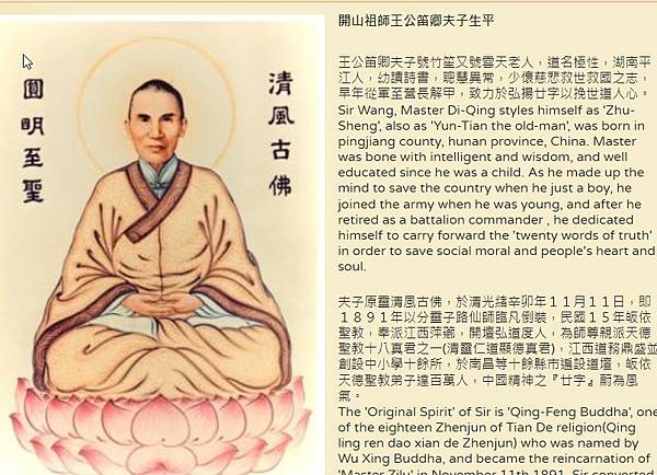 夫子原靈清風古佛,於清光緒辛卯年11月11日,即1891年以分靈子路仙師臨凡倒裝,民國15年皈依聖教,奉派江西萍薌,開壇弘道度人,為師尊親派天德聖教十八真君之一(清靈仁道顯德真君),江西道務鼎盛並創設中小學十餘所,於南昌等十餘縣市遍設道壇,皈依天德聖教弟子達百萬人,中國精神之『廿字』蔚為風氣。