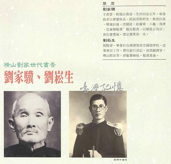 劉家驥先生:新竹縣橫山鄉人,生於1866年,字香雲,號橫山逸叟,卒於民國37年,享壽83歲。