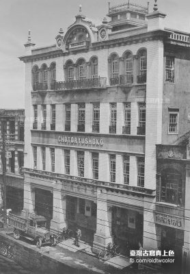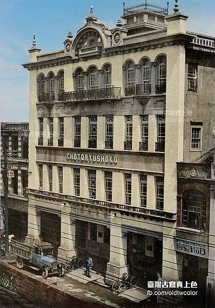 圖為日本時代大稻埕華麗建築「張東隆商行」影像數位上色,位於今延平北路南京西路交叉口東南側附近,目前建築南側1/3被拆除改建,北側2/3建築尚存(第一化妝品,外觀有改變),上方華麗山牆則早已消失。