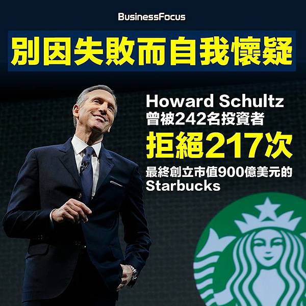 創業夢不被看好,曾遭拒217次,這就是世界知名咖啡品牌Starbucks創辦人舒爾茨(Howard Schultz)白手興家的故事。(2) BusinessFocus - 貼文 | Facebook https://bit.ly/3OnODy0
