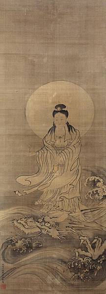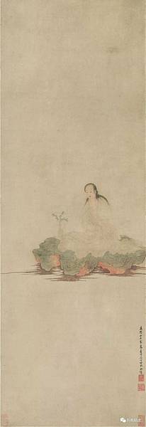 《觀音圖》為白色素衣觀音大士正端坐於褐底青石之上,雙目下垂、朱唇輕啟,似有俯覽世間萬物百態之勢,身邊左手置一淨水梅瓶,並插新篁數枝。整幅畫面氣韻素雅超逸、一片靜謐、天機造化、毫無矯揉造作之態。此幅作品證實了丁雲鵬在36歲之時,極有高深的文化藝術和美學修養、儒釋的虔誠心態、恬淡無欲的心境,以及不斷尋求“以心寫物”的藝術探索和追求。