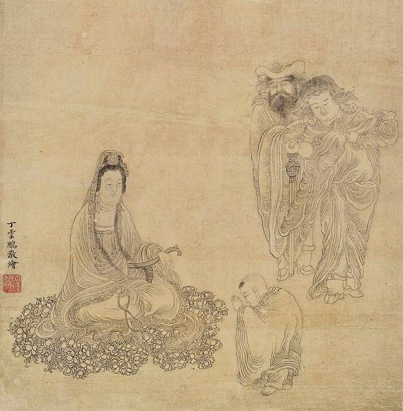 丁雲鵬(1547~1628)明代畫家。字南羽,號聖華居士,安徽休寧人,著名畫家,他能詩書,擅繪畫,白描、人物、山水、花卉、佛像、墨模無不精工。在丁雲鵬一生的繪畫作品中,以人物畫為多,也最著稱。他精研釋道人物,得法吳道子;白描師自李龍眠,絲發之間,而眉睫。卒年不詳,天啟五年(1625)尚在作《白馬馭經圖》,瓚子,詹景鳳門人。書法學鐘、王。畫善白描人物、山水、佛像,無不精妙。白描酷似李公麟,絲發之間而眉睫意態畢具,非筆端有神通者不能也。供奉內廷十餘年。他與董其昌、詹景鳳諸人交遊,故流傳作品多有董其昌、陳繼儒等人的題贊。董其昌贈以印章,曰“毫生館”。其得意之作,嚐一用之。萬曆八年(1580)作江南春扇,天啟元年(1621)作夥溪漁隱圖