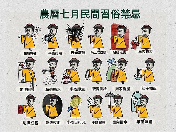 註:以上1至5項為農曆七月不宜,6至12項為平常就不宜