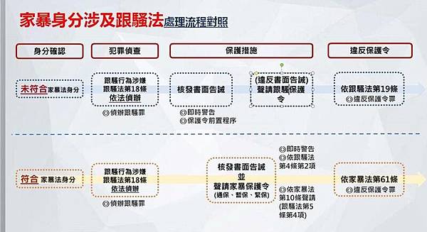 金門縣警局表示,「跟蹤騷擾防制法」聲請保護令分為「未符合家暴法身分」、「符合家暴法身分」;此金門案例與6月初宜蘭發生第1起依違反跟騷法聲押獲准案例不同,金門案例女性被害人與加害男子非屬家庭成員關係,而非家暴法家庭成員關係在跟騷法實行前是無法聲請保護令,此案女性受害人依據「未符合家暴法身分」取得保護令,更符合跟騷法保護女性的精神;根據警政署資訊,金門是「未符合家暴法身分」依跟蹤騷擾保護令建請羈押獲准的全國首例縣市。