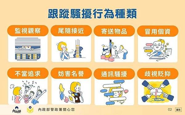 金門縣警察局局長廖高江呼籲,民眾如遇到跟騷行為,要立刻報警,在能力範圍許可下做適度的蒐證,例如用手機拍攝或錄下對方的不當舉動或聲音,或是把傳送的不雅訊息截圖保存下來,交給警方偵辦,警方絕對落實執法,充分保護民眾人身安全。全國首例!男瘋狂追求已婚女 非家暴法身分違跟騷保護令收押 - 社會 - 自由時報電子報 https://bit.ly/3ScQ5q2