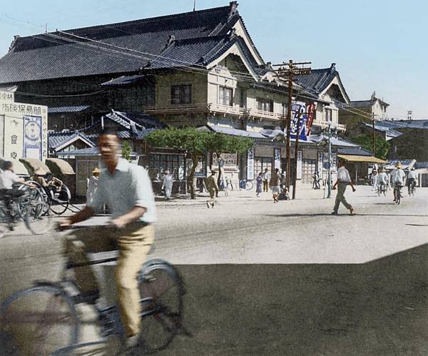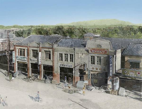 臺北圓公園即今日俗稱的建成圓環,日本時代為攤販聚集的開放式公園廣場。照片中背景紅磚街屋灑下和煦陽光,攤販老闆穿著西式背心,攤車上放著應是油炸過的雞蛋麵,推測應類似今日的意麵。意麵本來就是鴨蛋麵