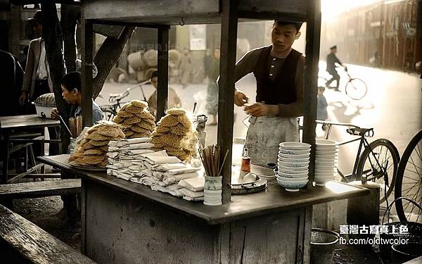 (1) 臺灣古寫真上色x今昔時光機交流團 | 這張攤子上的麵,有人認為是意麵、有人認為是雞絲麵,放大影像看麵條粗細感覺應該比較像意麵 | Facebook https://bit.ly/3d9aD2G