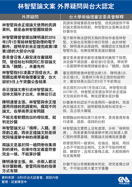 台大社會科學院學位論文違反學術倫理審定委員會,固於2022年8月9日認定林智堅抄襲余正煌,但林的指導教授陳明通也於同年7月23日、同年月30日聲明林未抄襲余的論文,各方立場與說法不一致。陳已表明推論所依據的事實,堪認是合理查證後所為,有相當理由確信為真實,難認主觀上有實質惡意,給予不起訴處分。
