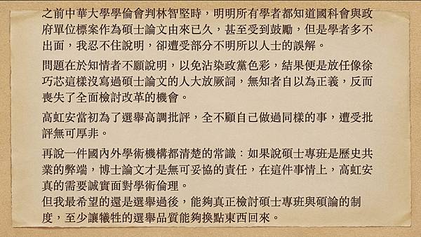 是以教育部的《專科以上學校學術倫理案件處理原則》有修法的必要,必須要允許所有無關個人隱私資訊的審理與論證過程皆可公開,不然所有學倫案件,都可以在各說各話的情況下選擇對自己有利的角度辯駁,無法從充分揭露的事實資訊中,經由聚焦辯論得到一個多數人較為認同的公評。也唯有如此,才有可能將學術倫理的案件拉回學術工作的領域討論,而不是被浮濫地拿來當作政治攻防的材料。