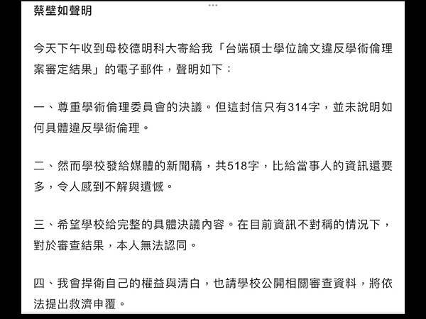二、本人一向主張林智堅並未抄襲,台大學倫會的判決是一場「世紀大冤案」,直到今日,他還是認為這是一場「世紀大冤案」。三、做為林智堅的指導教授,未來將繼續努力平反這項冤案,希望早日還給智堅一個公道,一份清白。