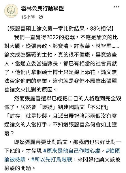 雲林公民行動聯盟於昨天於臉書PO文,指張麗善碩士論文第一章比對結果和康橋國際學院一篇文章有83%相似,張麗善選舉已經把自己的人格選到完全毀滅了,居然會「懷疑」劉建國論文「不公開」「封存」就是抄襲,即然張麗善要比對論文,那他們也只好比對一下,才發現原來是張自己作賊心虛,怕碩論被檢驗,所以先打烏賊戰,來閃躲論文該被檢驗的問題。