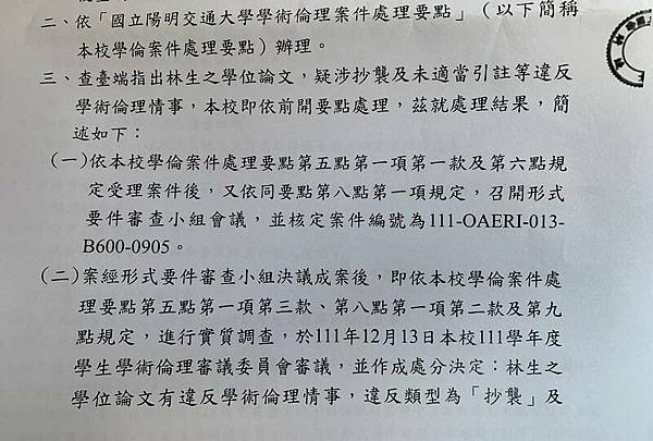 除了林智堅、鄭文燦論文案之外,台大表示,於去年7月21日至8月11日間,接獲4位民眾具名檢舉陳明通有違反學術倫理情事。學倫案檢舉人、國民黨立委王鴻薇今天收到學倫案調查結果,公開批評台大對陳明通違反學倫力挺到底,她深表遺憾,同時酸台大把退休金當作阿通師的畢業禮物。