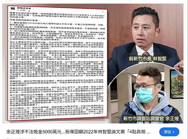 檢方今天指揮台北處、警政署督察室、嘉義市政府警察局及台北市政府警察局大安分局等單位,兵分5路搜索2名員警嘉義市辦公處所,約談明仁會傅姓要角及2警,並通知余正煌、侯俊榮、陳誌全3人到場查證;檢調將釐清兩案是否關聯?傅是否受余、陳所託向營業員討債? 余正煌涉不法吸金5000萬元…粉專回顧2022年林智堅論文案「4點真相」…評余正煌:心術不正、會為自身利益「反咬恩人」 - 放言Fount Media