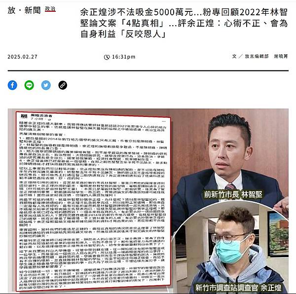 2025/05/08 21:38 余正煌涉不法吸金5000萬元…粉專回顧2022年林智堅論文案「4點真相」…評余正煌:心術不正、會為自身利益「反咬恩人」 - 放言Fount Media
